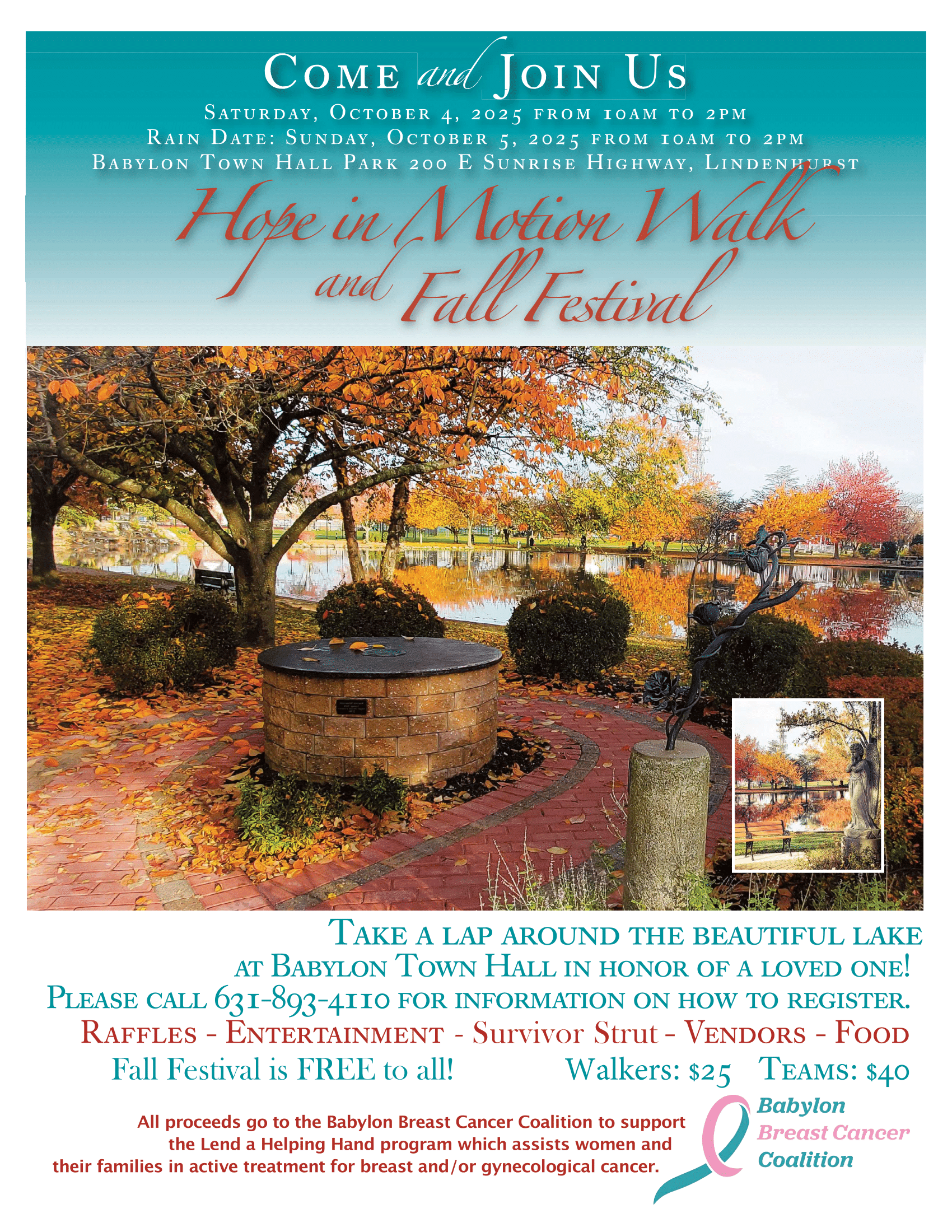 The Babylon Breast Cancer Coalition offers a wide variety of programs and services to educate and assist those in Babylon Township who are affected by breast cancer or any gynecological cancer. We can help you and your family during this difficult time with support, transportation to/from medical appointments, prepared food, house cleaning, financial assistance and more.